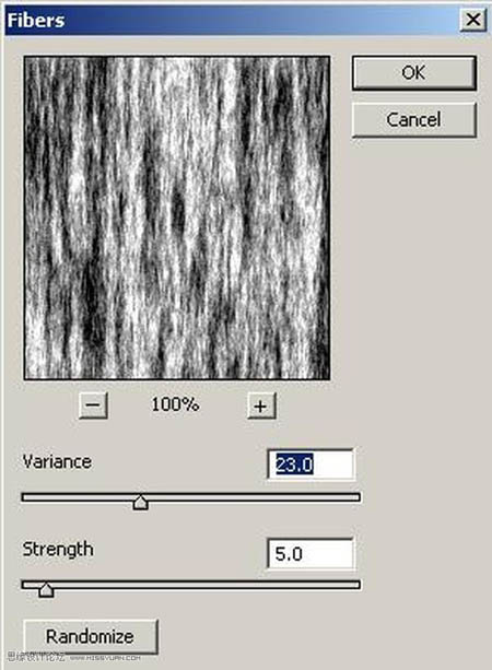 3、选择滤镜/渲染/纤维,设置差异为23,强度为5,确定后按Ctrl+D取消选区。