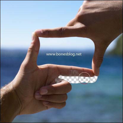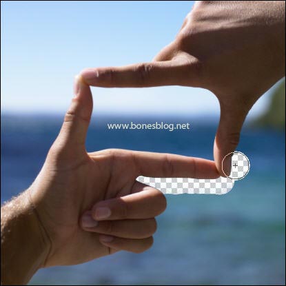 按Ctrl+Z退回上一步,再次在画面中使用背景橡皮擦工具,结果不错。那我们分析一下,这两次为什么参数没有改变,却有不同的变化呢?注意一下背景橡皮擦的光标,光标中间有一个“+”的坐标,当“+”光标位置在要擦除的位置上的时候,就能擦出比较好的效果。 |