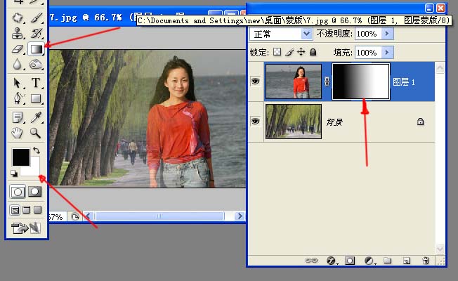 到这里我们是不是体会到了它与橡皮的不同?实际上它与橡皮最大的不同还在于它只是在蒙版上操作,没有对图片造成一点破坏,而橡皮擦过后,图片的像素已经擦掉了。因此,在蒙版上如果做的不满意,我们删掉蒙版就行了,不会对图片有任何影响。