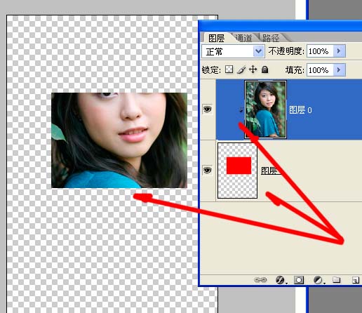 我们来实际操作一下: 还用这个MM,在MM层下层填充一个小一些的方形,在两个图层间按着Alt键点击,就对MM层创建了剪切蒙版,当然也可以在菜单里建。看看效果,再拖动一下方块层,再看看效果。 |