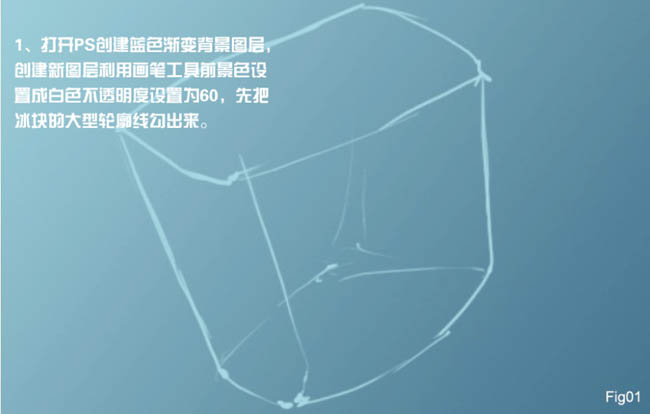 | 1、打开PS新建一个大小适当的文档,背景拉上蓝色渐变。新建一个图层,选择画笔工具,把前景颜色设置为白色,画笔不透明度设置为:60%,先把冰块的大体轮廓线勾画出了,如下图。 |