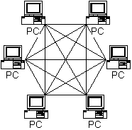 如果一个网络只连接几台设备,最简单的方法是将它们都直接相连在一起,这种连接称为点对点连接。用这种方式形成的网络称为全互联网络,如下图所示。