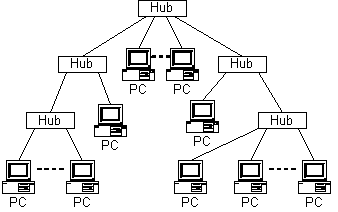 这种网络拓扑结构的一种扩充便是星行树,如下图所示。每个Hub与端用户的连接仍为星型,Hub的级连而形成树。然而,应当指出,Hub级连的个数是有限制的,并随厂商的不同而有变化。