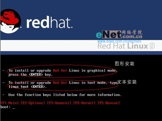 第二步:系统会自动进入到Linux安装初始画面,第一要选择安装的方式,其中如果要选择文本界面安装需要在引导命令处输入命令linux text,如果要选择图形界面安装的话直接安回车Enter。笔者使用的是图形安装。