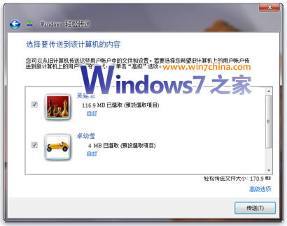 5.在“选择要传输到该计算机的内容”页面上,您可以决定用户帐户从 Windows XP 到 Windows 7 的传输方式。