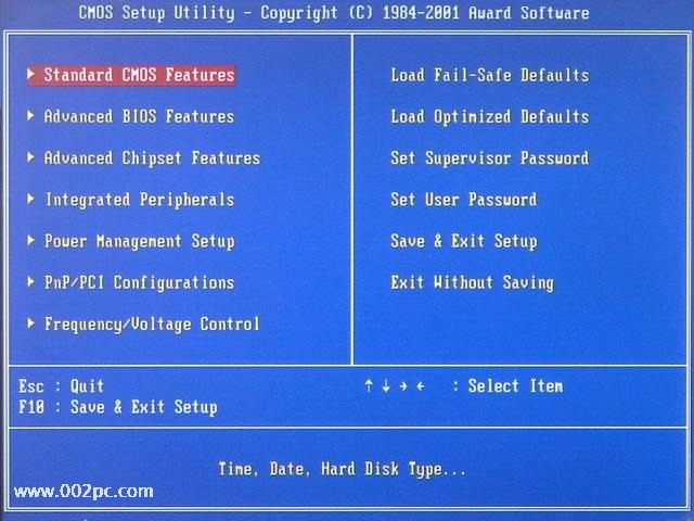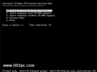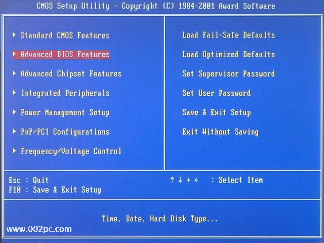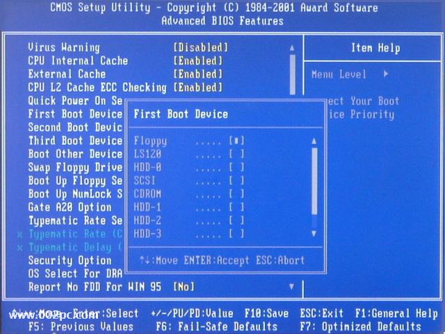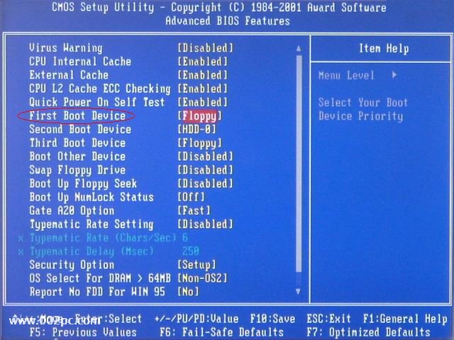 第一部分∶用软盘启动进入DOS 一、设置软驱为第一启动盘。 当电脑刚刚启动出现如下 图1 时 按下“DEL”键或“Delete”键不放手,直到出现 图2 如下 即进入了系统基础输入输出CMOS设置,在这里按“向下或向上”箭头键选择“Advanced BIOS Features”项。如下图3 然后按“Enter”回车键,即进入“Advanced BIOS Features”项设置,如下图4 这里的“First Boot Device”项为设置第一启动盘项,“Second Boot Device”项为设置第二启动盘项,“Third Boot Device”项为设置第三启动盘项。 在这里我们将“First Boot Device”项设置为“Floppy”即软盘,"cdrom"就是光盘启动,现在安装系统一般都用光盘启动,“Second Boot Device”项设置为“HDD-0”即默认硬盘。设置方法∶选“First Boot Device”项按“Enter”回车键,出现如下 图5 所示 (上图中Floppy--软盘、HDD-0--硬盘、CDROM--光盘)然后按“向上或向下”箭头键,选择 “Floppy”项,接着按“Enter”回车键,即完成该项设置并重新返回了图4画面,你可以看到该项设置已经改变了。用同样的方法设置“Second Boot Device”项为“HDD-0”。设置完成后按“Esc”键退出到(图1)画面,然后按“向右、向下”键选“Save & Exit Setup”项,该项意思(保存设置并退出),如下图6(www.002pc.com) 选“Save & Exit Setup”项后按“Enter”回车键即出现如下图7 按 “Y”键回车,系统会保存认置并重新启动。到这里为止,系统第一启动盘项设置完成,以后只要扦入98或Me启动盘到软盘驱动器(A盘),启动电脑即可以启动到DOS系统,不用再次设置。建议在安装完系统后,如果不需要经常转到DOS系统时,将第一启动盘项设置成“HDD-0”。下面将介绍启动的过程。 二、启动到DOS系统的过程 将98或Me启动盘扦入软盘驱动器,然后启动或重新启动电脑至出现如下图8 图8的启动选单中;第一项为∶启动时加载光驱驱动程序,第二项为∶启动时不加载光驱驱动程序,第三项为∶启动帮助。如果你不选择,系统在30秒后默认启动第一项。用“向下或向上”箭头选择键选择第二项“Start conputer without CD-ROM tupport”项即不加载光驱驱动程序项。然后回车。即可顺利启动到纯DOS系统。将出现如下图9的画面,这时已完全进入。 恭喜你!纯DOS系统启动成功。 提示∶用启动盘启动进入DOS系统时,用加载光驱驱动程序模式下启动,光驱的盘符比实际盘符向后推迟一个盘符,如果你的光驱在Windows系统中是F盘,即在这里变成G盘;如果你的光驱在Windows系统中是G盘,即在这里变成H盘;依此类推。如果你在启动DOS时选择加载光驱驱动程序即可在图9所示的画面中的倒数第三行英文中显示出光驱所用的盘符。如果用启动盘启动进入DOS系统时,不加载光驱驱动程序模式下启动,即进入DOS下不能读取光驱中的内容。 第二部分∶用98或Me安装光盘启动进入DOS 一、设置光驱为第一启动盘。(参考第一部分∶设置软驱为第一启动盘)这里不多说了。 二、用Windows 98安装光盘启动进入DOS系统 将光驱为第一启动盘后,把Windows 98安装光盘放入光驱中,重新启动电脑至出现如下图10 上图中提供三项选择。如果不进行选择,在30秒后自动进入第一项。三项选择分别为∶ 第一项“1. Start Windows 98 Setup from CD-ROM”(从光盘启动安装Windows 98系统) 第二项“2. Start computer without CD-ROM support”(加载光驱驱动程序进入DOS) 第三项“3. Start computer without CD-ROM support”(不加载光驱驱动程序进入DOS) 在这里要进入纯DOS就选第三项(选第二项也可进DOS),回车后出现如下图11所示 三、用Windows Me安装光盘启动进入DOS系统 将光驱为第一启动盘后,把Windows Me安装光盘放入光驱中,重新启动电脑至出现如下图12 选择第三项或第二项后回车即可进入DOS。
