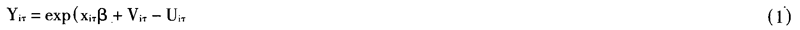 其中,Yiτ代表第i个企业在第T时期的实际产出,xiτ代表一组投入向量和与第i个企业在第,时期观察变量相关的其他解释变量;β为一组待估向量参数;Viτ为随机误差项,被假定服从标准的正态分布 N(0,σ2v),并独立于Uiτ;Uiτ为代表技术非效率的非负值随机变量,被假定具有独立分布的特性,因而服从截尾正态分布N(Ziτδ,σ2u)(在零处);Ziτ是和企业生产技术非效率相关的解释变量,δ为待估参数。