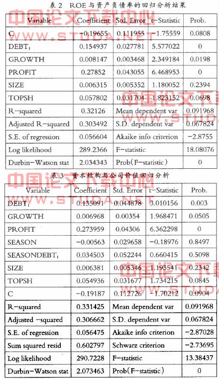 3、模型建立。模型1:KOE=a+bDebtl+r(controlvariable)+e,模型2:ROE=a+bDebt+r(controlvariable)+season+seasonDebt+e。Debt是总资产负债率;模型中1是检验资本结构与公司价值关系;模型2中加入市场繁荣度虚拟变量,当市场处于繁荣期时,season取1,否则season为0,该模型是检验市场周期性因素对资本结构和公司价值相关性的影响。