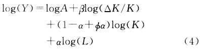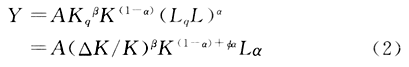本文建立的内生经济增长模型参考了内尔森的建模思路,在模型中加入了资本质量要素。模型假设新投入的资本要比以前投入的资本有更高的质量,资本的质量与资本存量的平均使用时间成反比。根据推导可以证明(限于篇幅,推导过程略),资本存量的平均使用时间与资本存量的增长率成反比例关系。所以,在本文的模型中用资本存量的增长率(△K/K)来表示资本质量(Kq)。