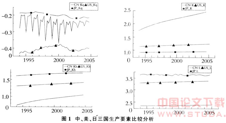 从劳动力数量要素的变化看,如图1右下图所示,三个国家的波动都很平稳,日本的劳动力数量要素略有厂降。