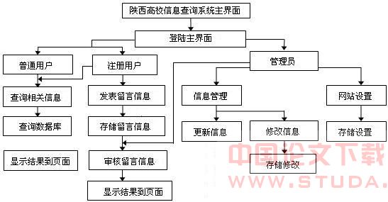 根据需求分析,本系统开发设计的目的是设计一个适合各个学校和社会其它部门或单位对陕西省高校的信息进行查询的一个网上查询系统,用户可以在网上迅速地按不同类别查找到自己所关注的学校的相关信息和所需要的资料,包括所要查找的高校的建校时间、建校历史、学校师资、基建规模、院系设置、硕士点、博士点等其它的关于该学校的主要信息,使得用户对信息的查找变的轻松、快捷和方便。