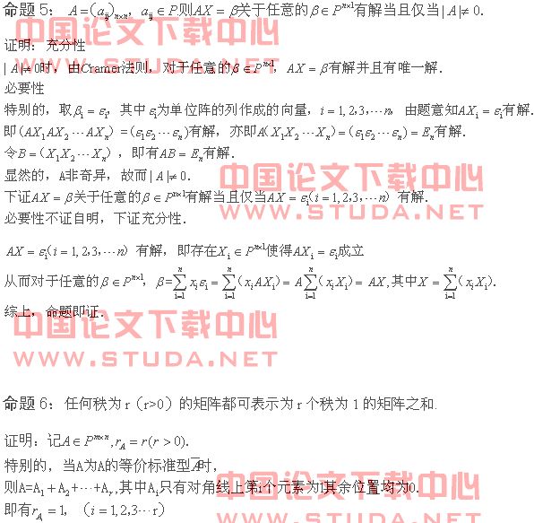 以上所列举的几个命题仅是高等代数天空中的几颗渺小的星星,在浩瀚的高等代数天空中有无数的课题等待着我们去研究,去发现.当我们研究这些问题的时候,需要特别注意问题背景下的基本元,如矩阵的等价标准型,向量组的极大无关组,线性空间的标准基底,等等.把握这些基本元不仅是我们学习时需要注意的,而且也是解决困难题的一大方法,愿各位读者能从本文中获取些许东西,这正是我想送给大家的.