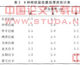 实验材料:长兴白板纸(250g/m。)、华明白板纸(250g/m。)、华丰白板纸(250g/m。)、鸿泽白板纸(250g/m)、凡南白板纸(250g/m。)、亚太白卡纸(250g/m)、太阳白卡纸(250g/m。)、荷兰白卡纸(250g/m);采用的油墨是天津东洋油墨有限公司的胶印亮光快干型油墨(黄、品、青)。
