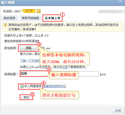 3、“从本地上传”视频,(该功能为黄钻LV4~LV6、黄钻LV7及年费黄钻用户特权)到日志中;