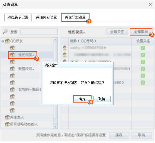 选择‘关注好友设置’,选择某位QQ好友(好友分组只能单个进行选择)=》取消=》确定=》保存。