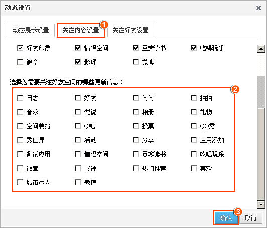 选择‘关注内容设置’,将“选择您需要关注好友空间的哪些更新信息”下方所有类别方框里的勾去掉,‘确认’即可。